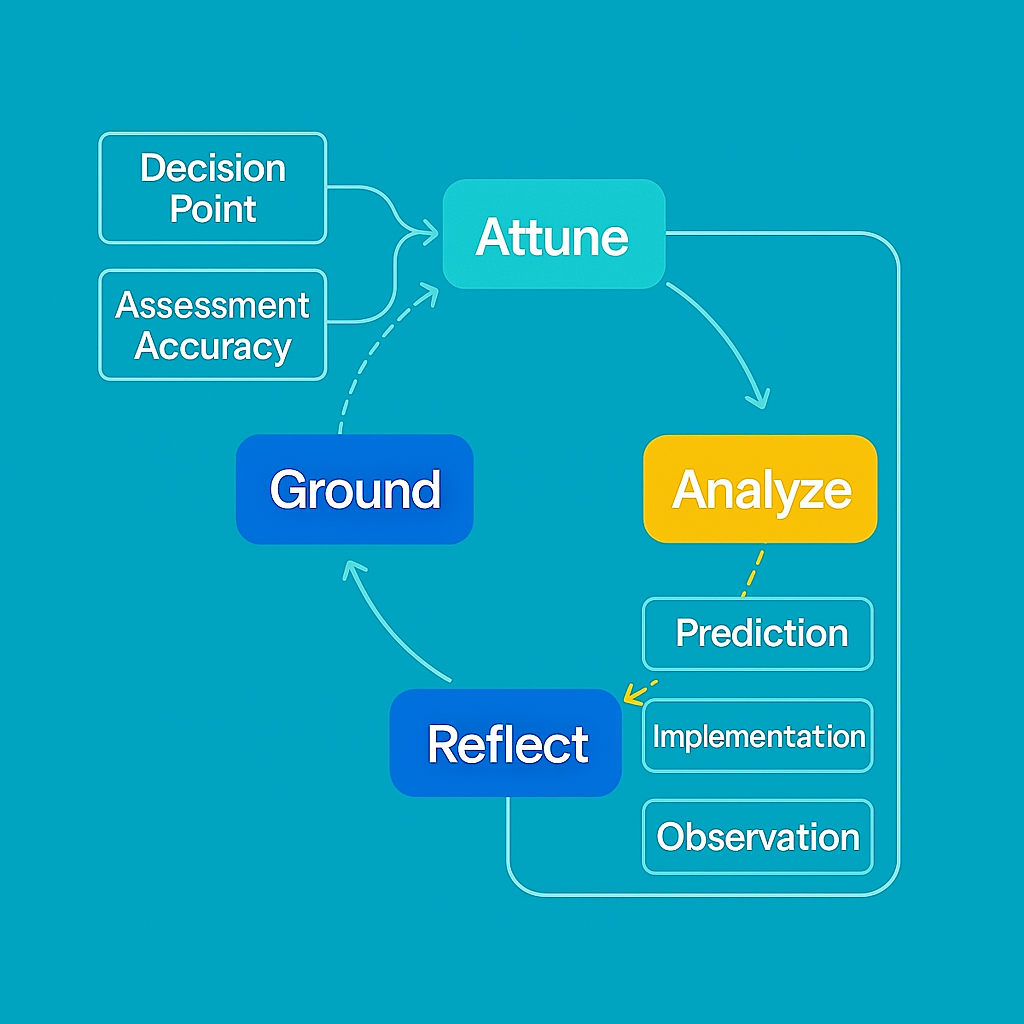 This diagram maps Micro-ARP as a moment-by-moment decision loop: professionals attune at a decision point, analyze inputs and predictions, reflect on observations and implementation, and ground before proceeding — reducing ethical drift in real time.