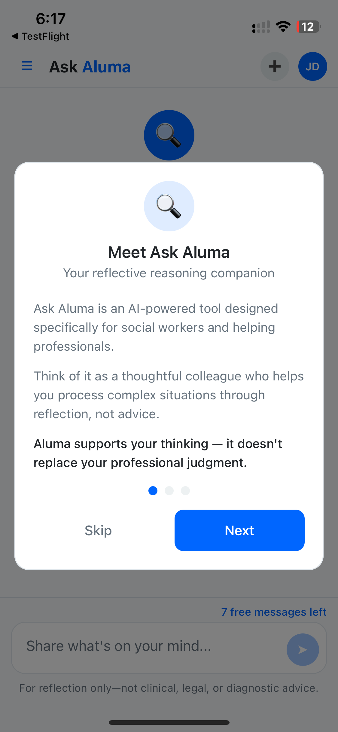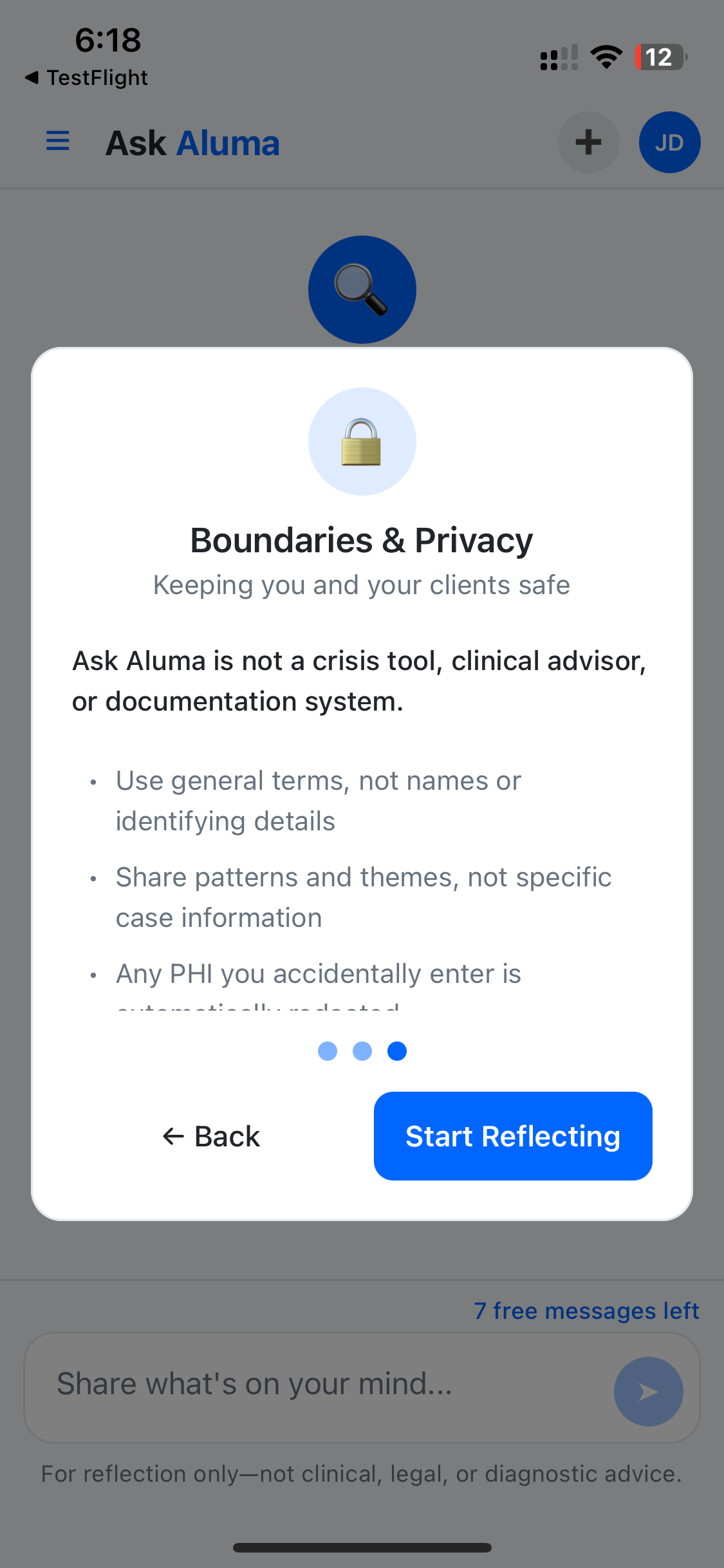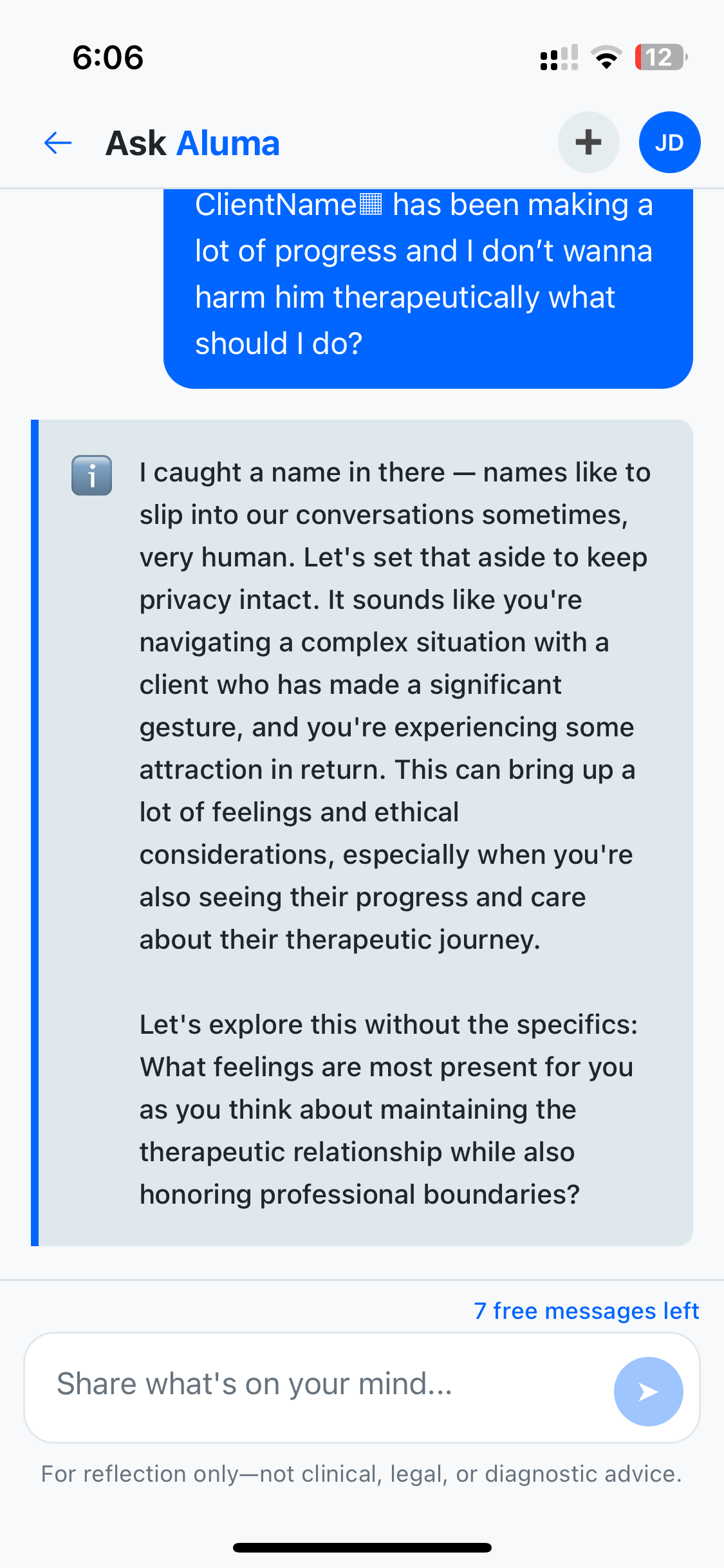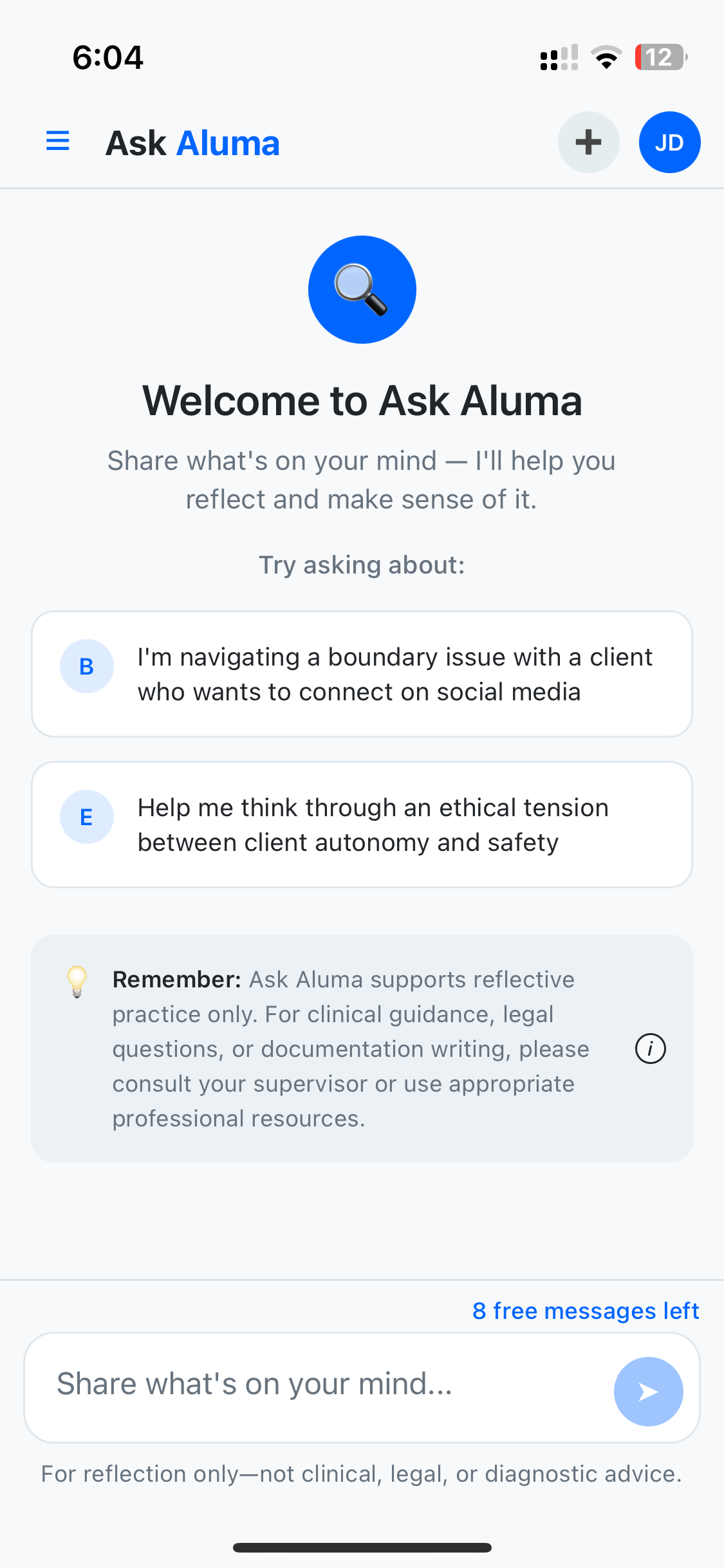 Share your professional challenges using general terms — no client names or identifying details needed. Ask Aluma will ask thoughtful questions to help you explore ethical considerations, emotional responses, and different perspectives.
